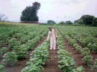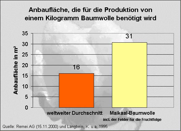 Die Maikaal-Bauern bestellen ihre Felder per Hand. Schwerere Arbeiten werden mit Ochsengespannen erledigt. Die Rinder liefern gleichzeitig den Dünger für die Felder und für die Betreibung einer Biogasanlage. Das Pflücken von Hand erhöht die Qualität der Baumwolle, da nur reife Kapseln geerntet werden. |